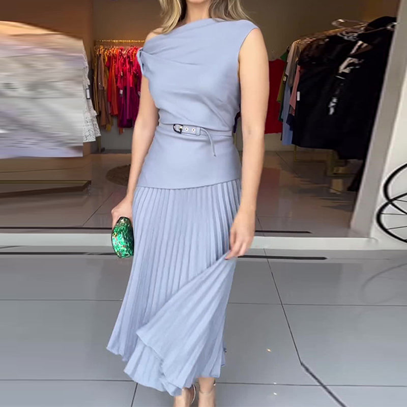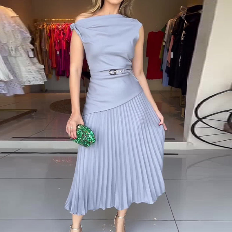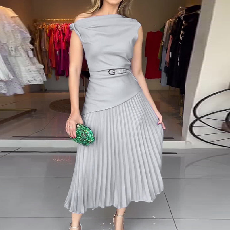 Damen Off-Shoulder Plisseekleid mit Gürtel