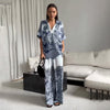 Blaues, bedrucktes, leichtes Set mit V-Ausschnitt-Oberteil und Hose