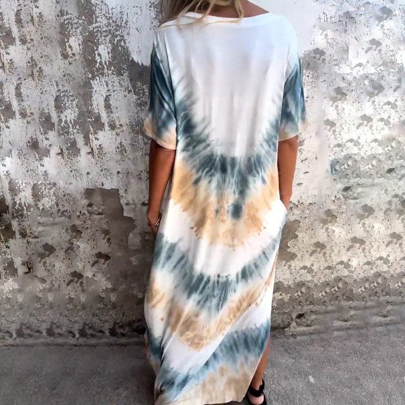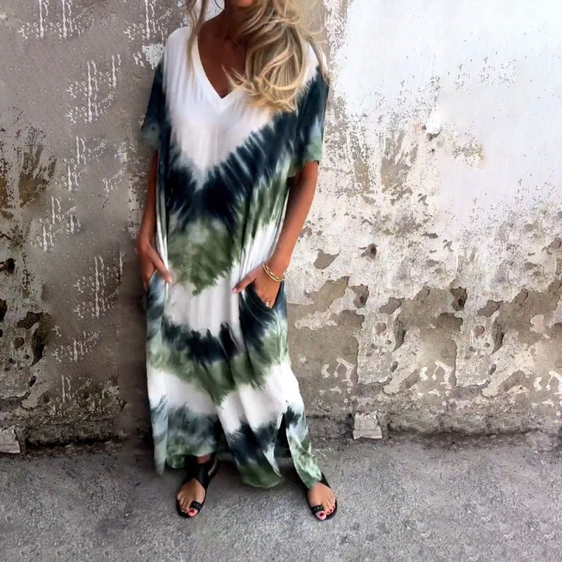 Starten Sie mit Stil und Komfort in den Sommer mit unserem lässigen, lockeren, bedruckten langen Kleid mit V-Ausschnitt. Dieses Kleid aus leichtem und atmungsaktivem Material sorgt dafür, dass Sie in den heißen Sommermonaten kühl und entspannt bleiben. Die lockere, entspannte Passform bietet Bewegungsfreiheit und eine schmeichelhafte Silhouette für alle Körpertypen.