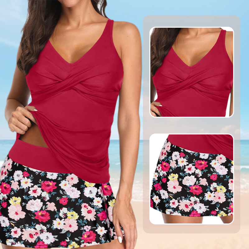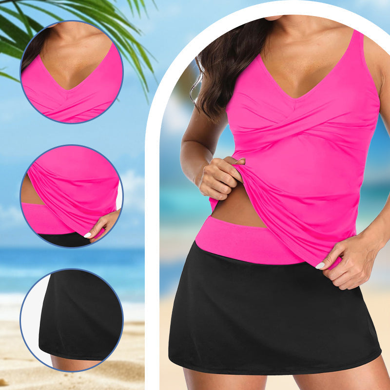 🔥Letzter-Tag-Aktion: 50 % RABATT🔥💝🌊Oberteil mit gekreuzten Trägern am Rücken und gefüttertem Rock, separater Badeanzug