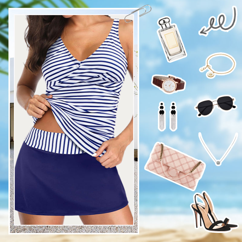 Stilvoller zweiteiliger Tankini mit Bauchkontrolle, verstellbaren Trägern, integriertem BH und sportlichen Shorts; perfekt für Wasseraktivitäten und den Sommer.