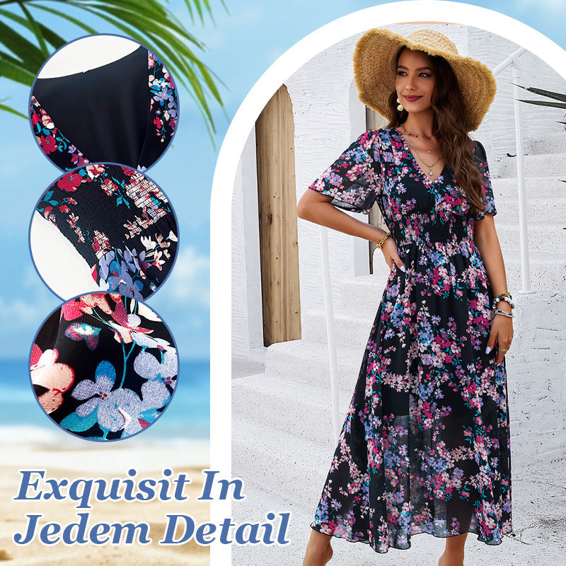 Lieferumfang: 1 × Elegantes, bedrucktes, fließendes Damenkleid mit V-Ausschnitt