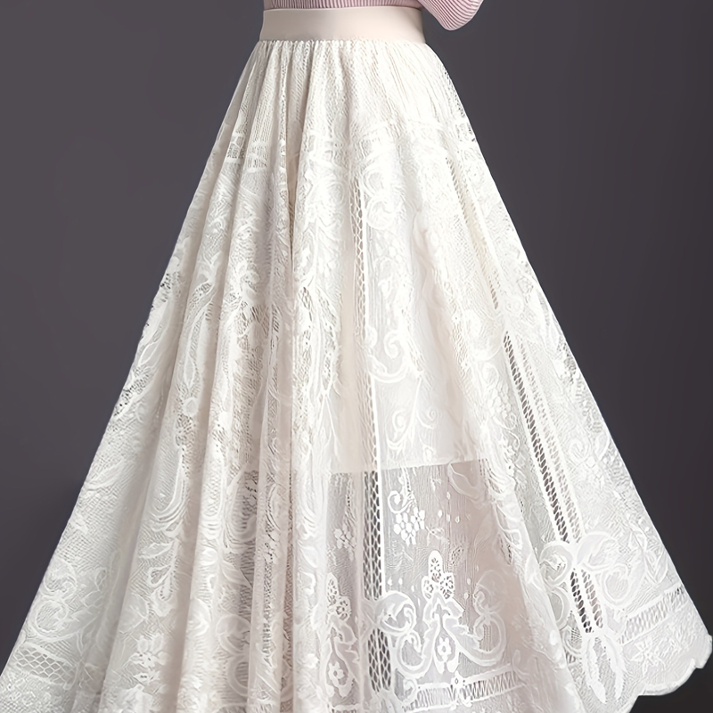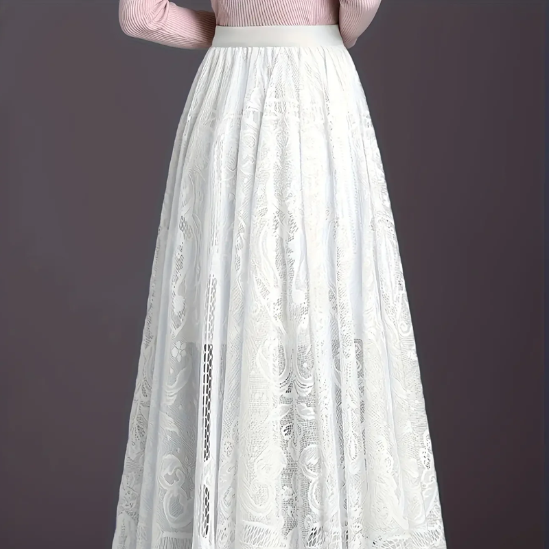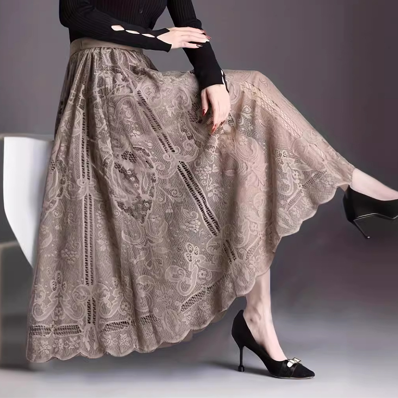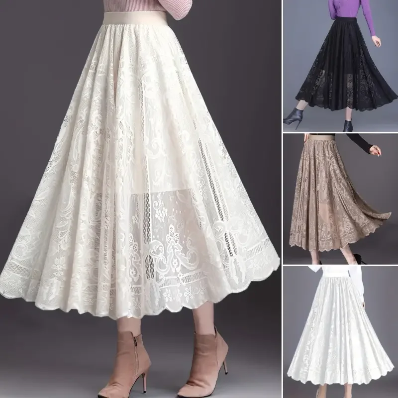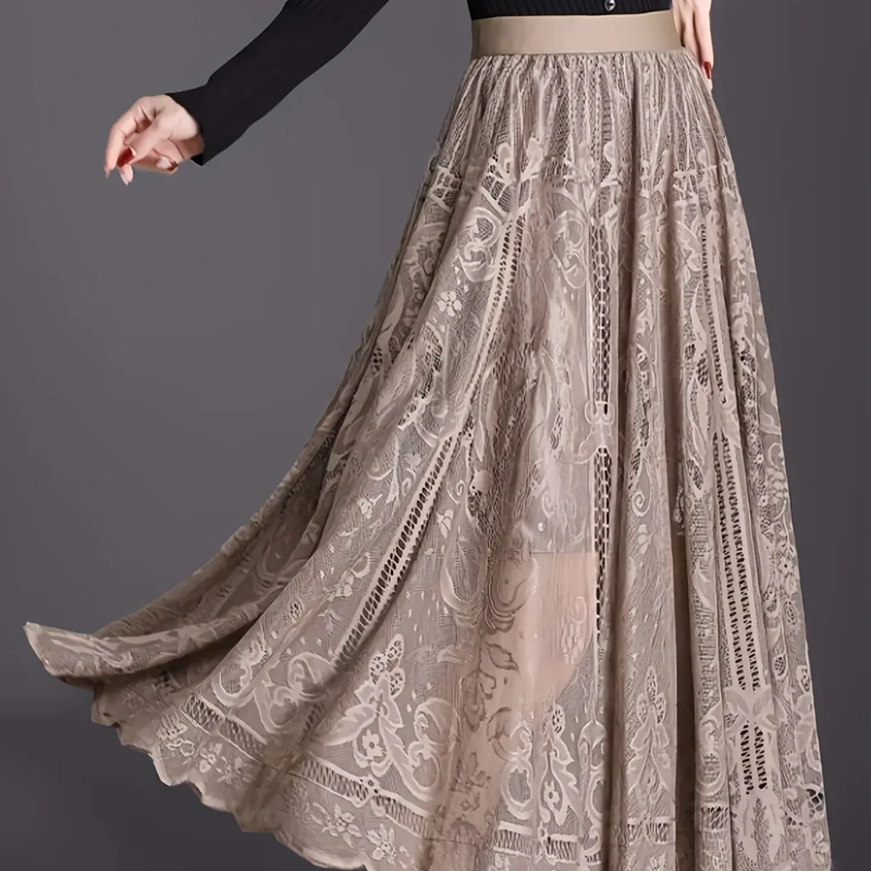 ELEGANTE SPITZENEINSÄTZE: Fein gearbeitete Spitze durchzieht den Rock und verleiht ihm eine anmutige, feminine Note, die Ihren Look aufwertet, ohne ihn zu überladen. Perfekt für eine sanfte und dennoch elegante Ausstrahlung.