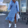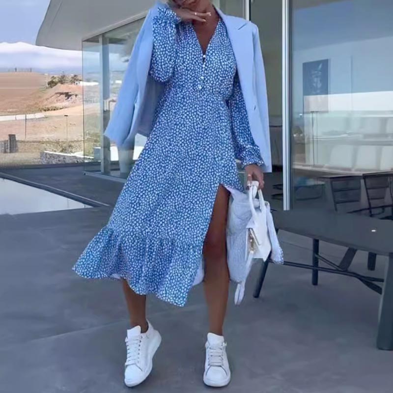 💥Blaues bedrucktes Langarmkleid mit V-Ausschnitt für Damen