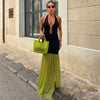 KÜHNE ARCHITEKTONISCHE KANTE - Schlichtes Schwarz trifft auf leuchtendes Grün in scharfem geometrischen Kontrast. Der symmetrische Ausschnitt, umrahmt von einer polierten Metallschnalle, sorgt für urbanen Minimalismus - perfekt für Vernissagen, Cocktails auf dem Dach oder als Blickfang um Mitternacht.