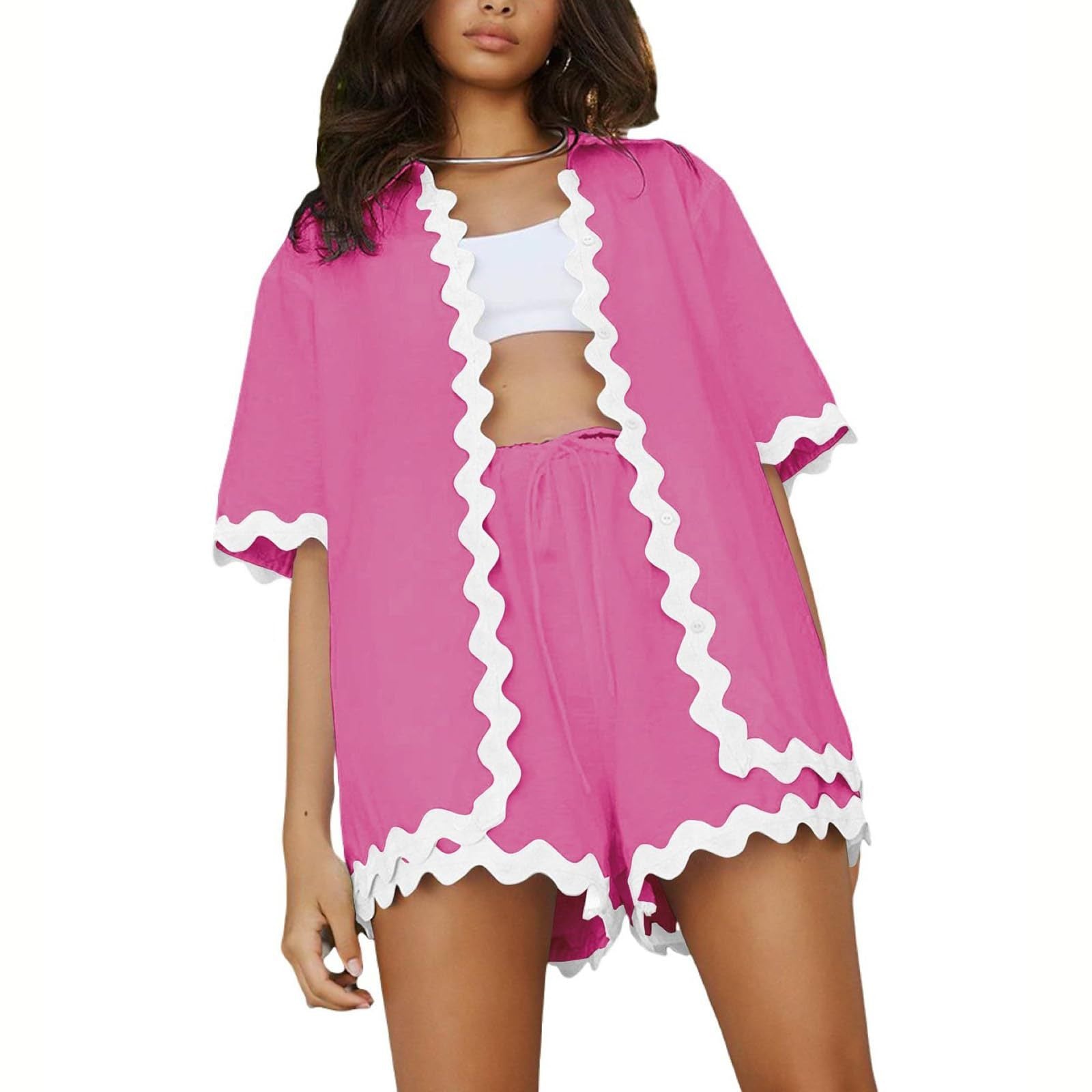 Küsten-Chic-Design – Frische weiße Wellendetails zieren den Saum dieses luftigen Cardigan-Shorts-Sets und verbinden maritimen Charme mit modernem Minimalismus. Der Reverskragen und die kurzen Ärmel verleihen Eleganz, während Blau-, Rosa- oder Marinetöne die Ruhe des Meeres vermitteln. Eleganz vom Strand bis zur Straße, neu definiert.