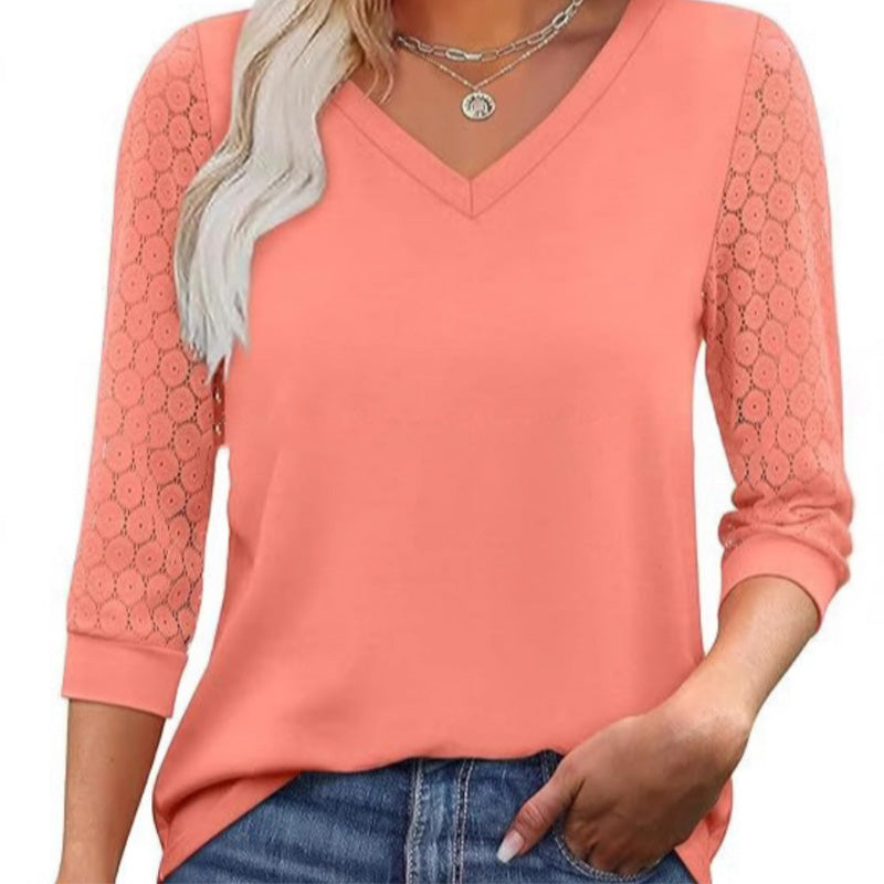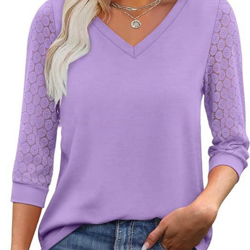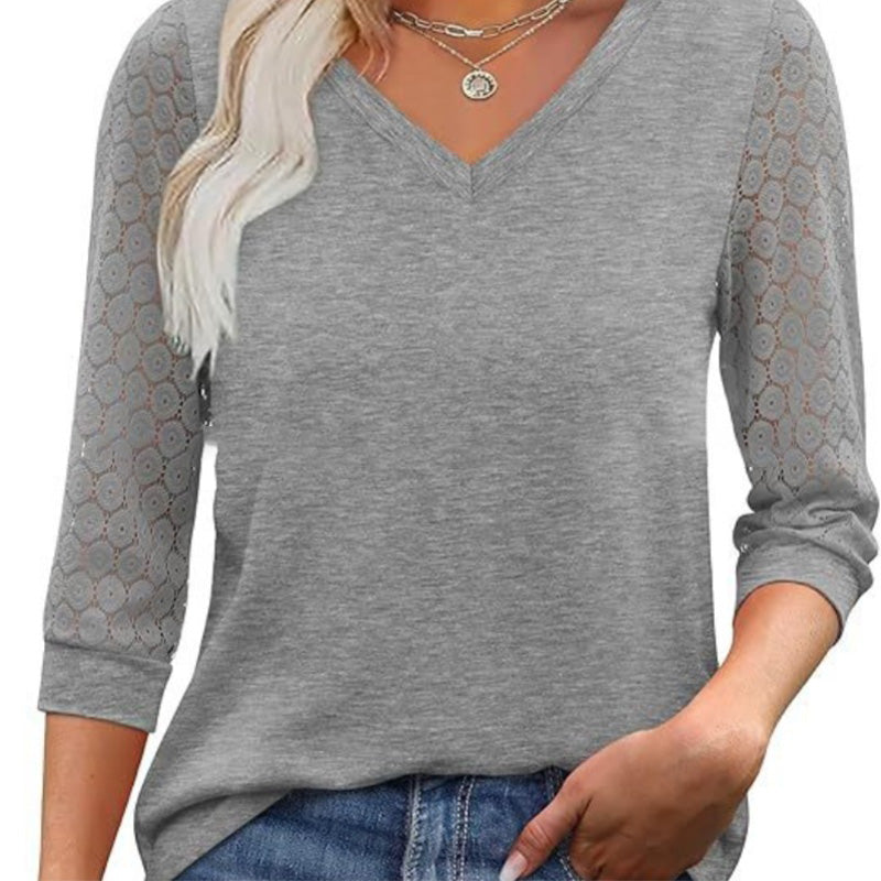 Lässiges Damen-Top mit V-Ausschnitt und 3/4-Ärmeln aus Spitze