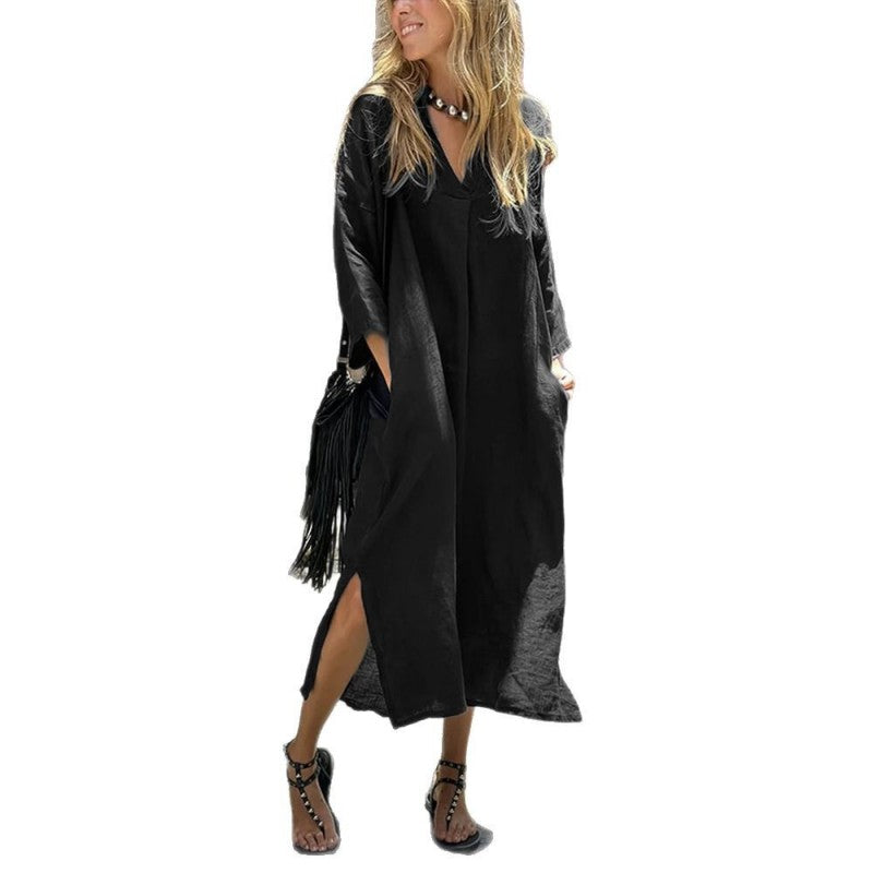 ⏳Zeitlich begrenzter Rabatt🩷Lässiges langes Kleid mit V-Ausschnitt, Taschen und geschlitztem Saum für Damen