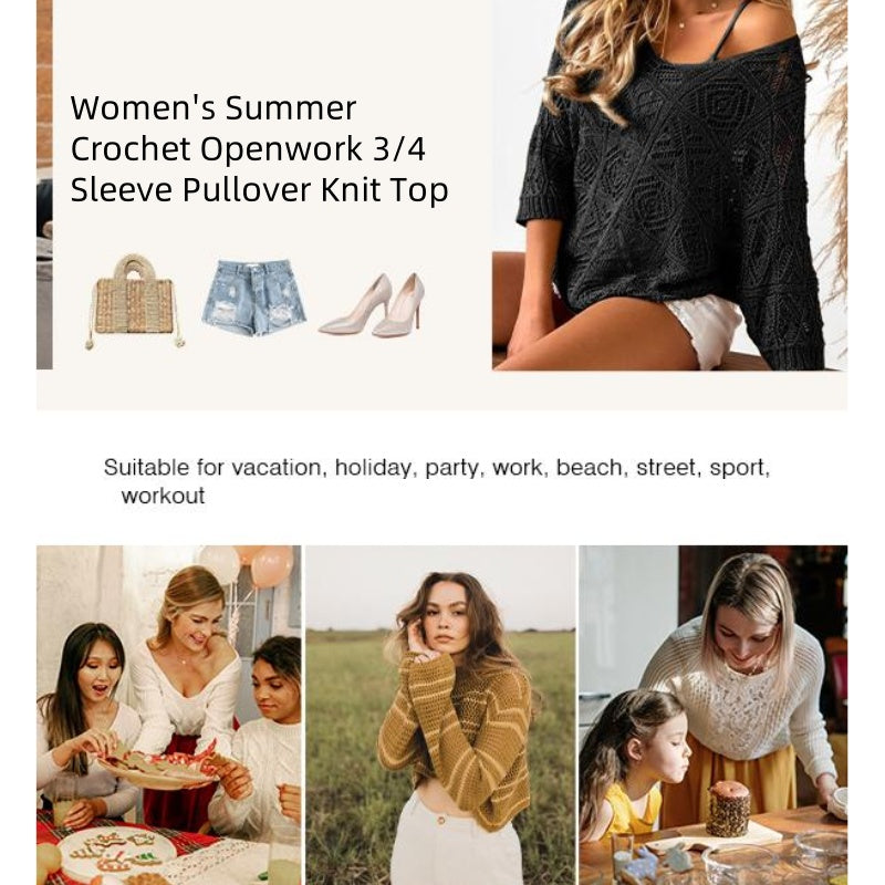 Damen Sommer Häkeln Durchbrochenes 3/4 Ärmel Pullover Strick Top