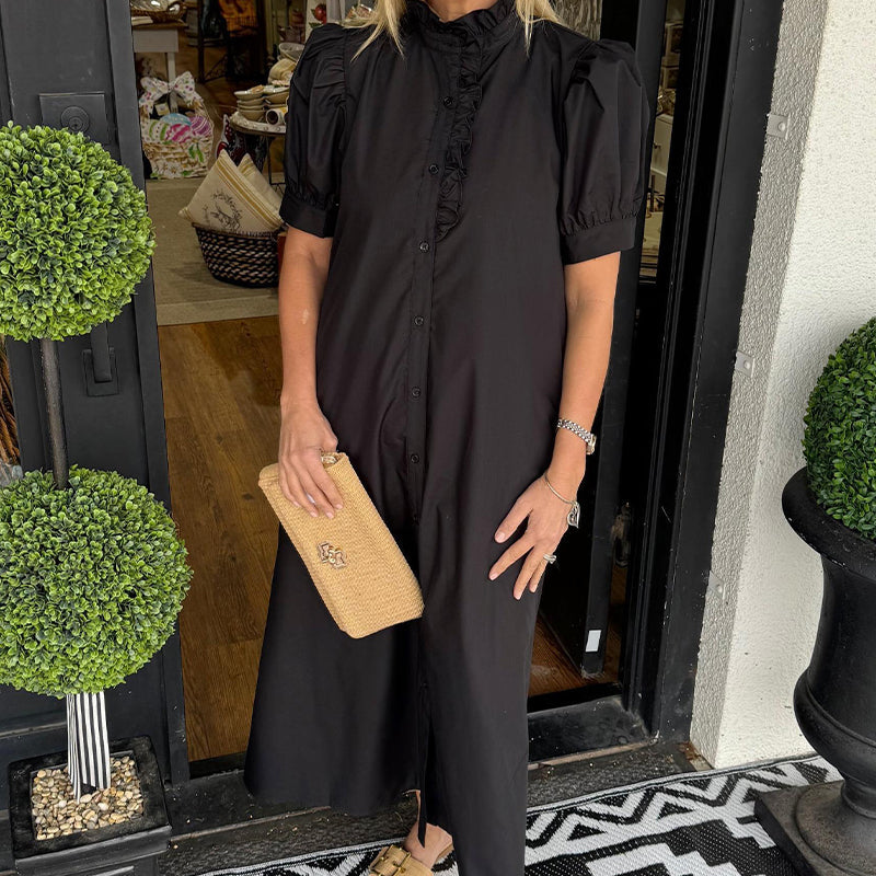 Lieferumfang: 1 x lässiges, einfarbiges Damenkleid mit Stehkragen und Knopfleiste.