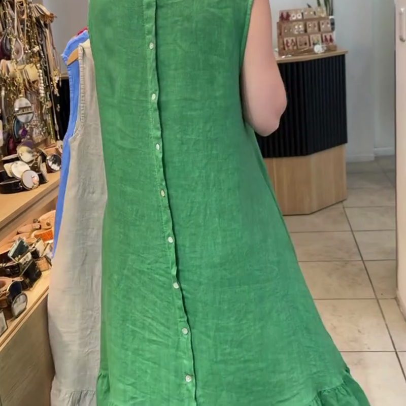 DEKORATIVE KNÖPFE AUF DER RÜCKSEITE: Die Rückseite des Kleides weist eine Reihe weißer Knöpfe auf, die eine dezente, aber stilvolle dekorative Note verleihen und das minimalistische Design unterstreichen.