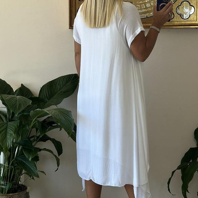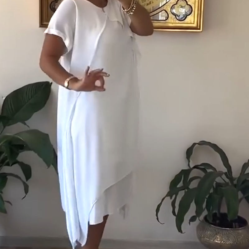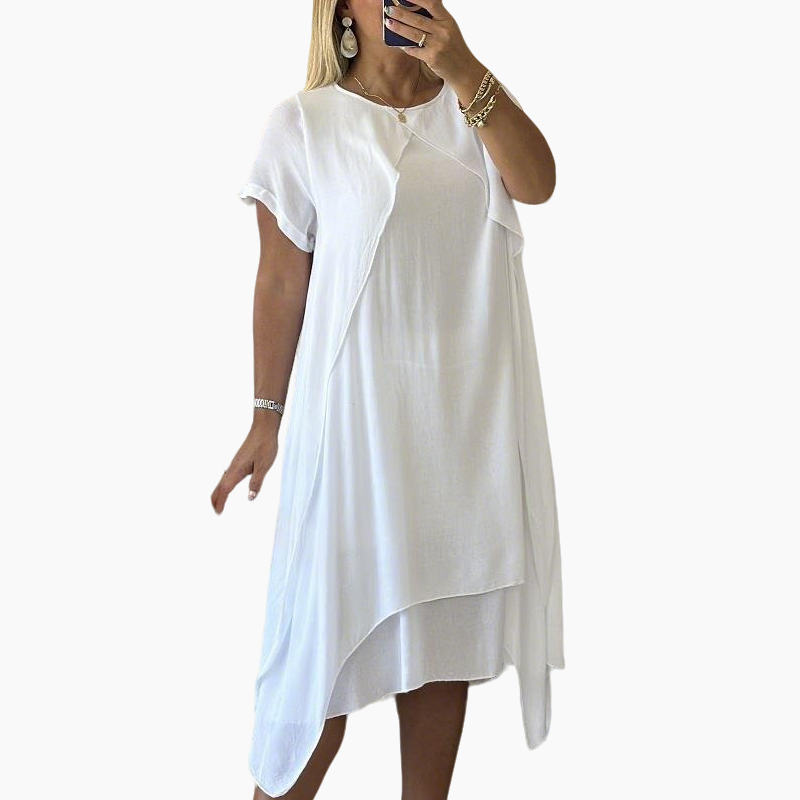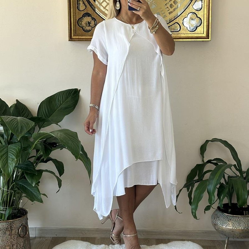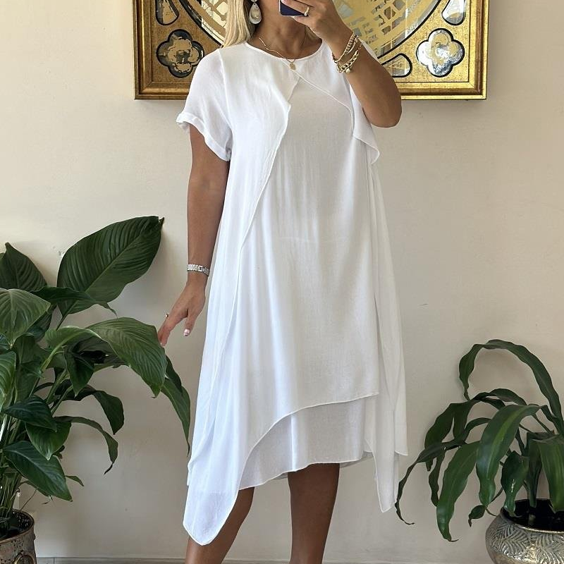 ELEGANTE LAGENOPTIK – Dieses weiße Kleid besteht aus weichem, mehrlagigem Stoff, der elegant fällt und Volumen verleiht. Die luftig-leichten Lagen bewegen sich bei jedem Schritt mit und unterstreichen eine mühelose Feminität.