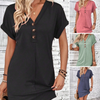 Damenmode Hundert Einfarbige Kleider mit Knöpfen, V-Ausschnitt und Rollärmeln