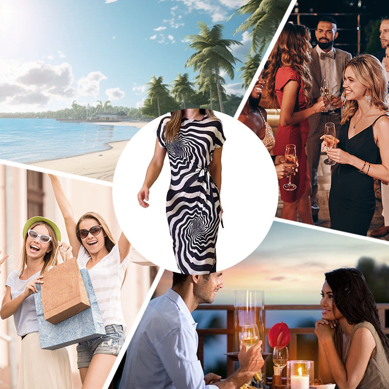 BEQUEME KURZE ÄRMEL UND RUNDHALSAUSSCHNITT: Der klassische Rundhalsausschnitt und die kurzen Ärmel bieten atmungsaktiven Komfort und machen dieses Kleid ideal für wärmere Tage, legere Anlässe oder als saisonale Lagenkleidung.
