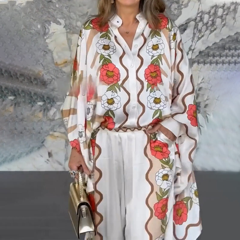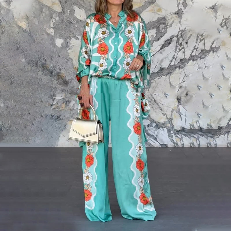 Stilvoller Damen-Zweiteiler mit Blumenmuster: Bluse & Hose