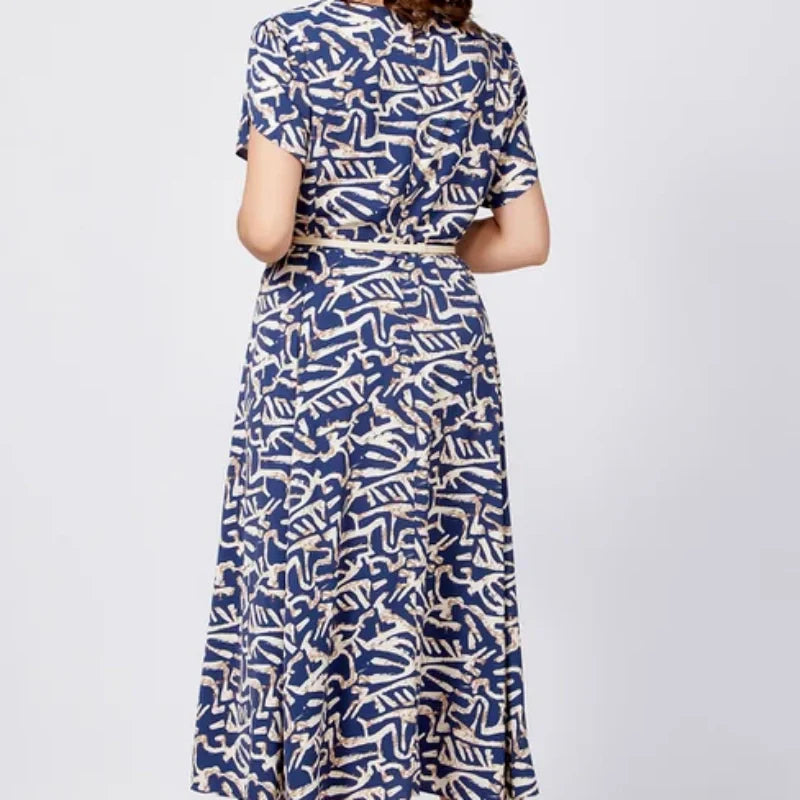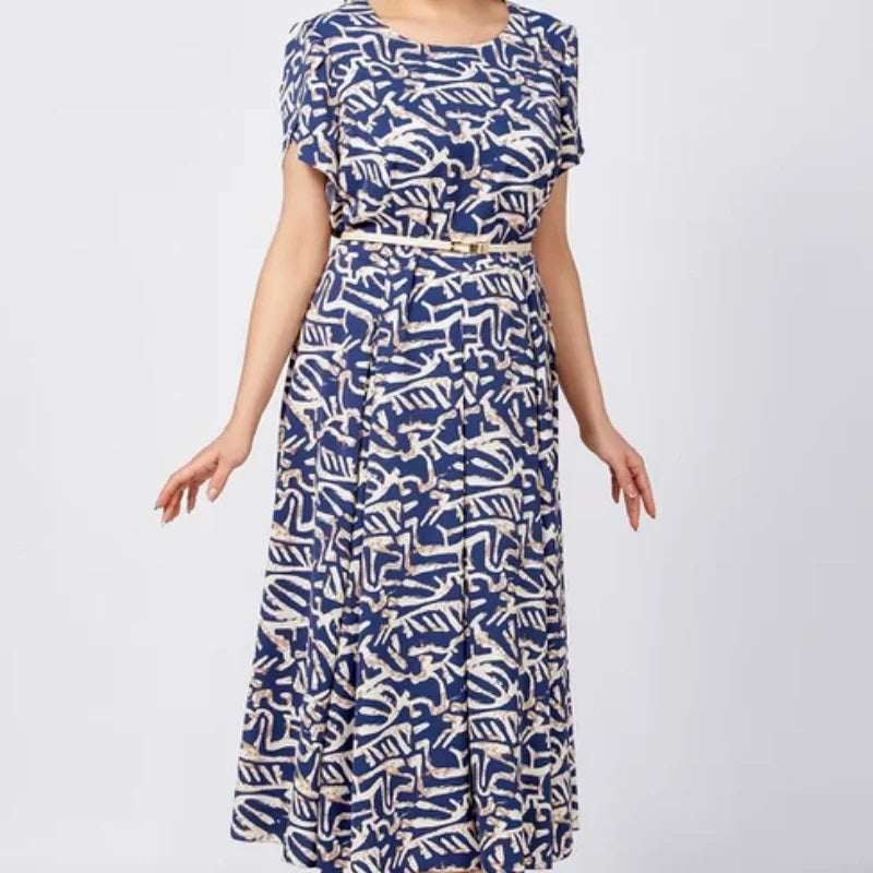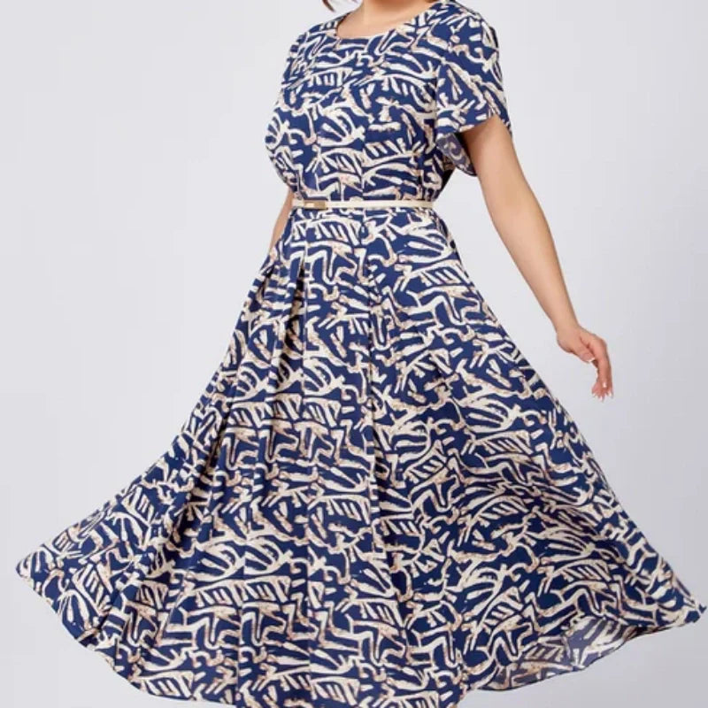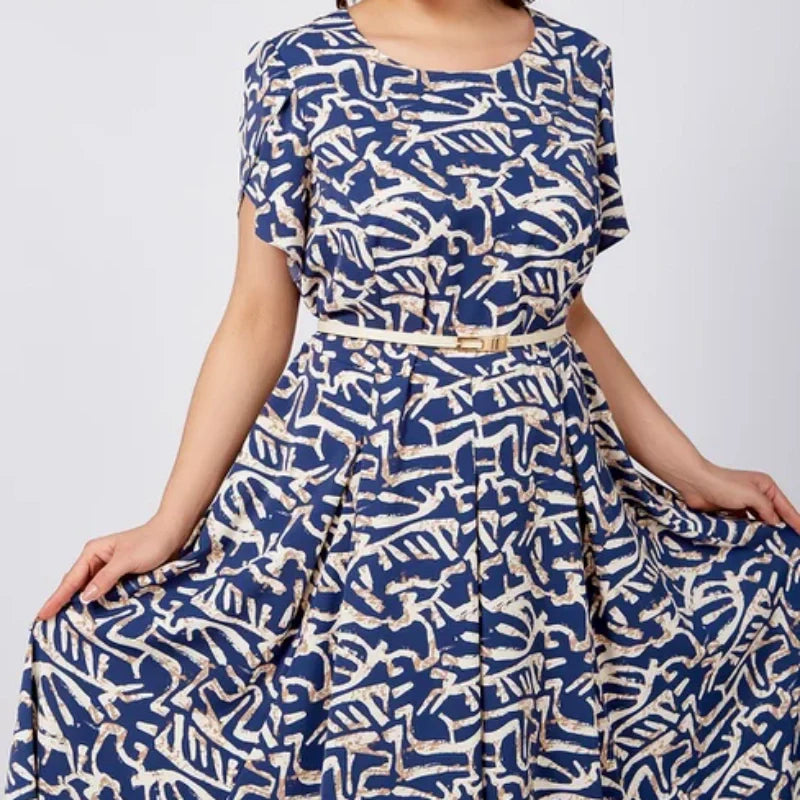 Trendy Damenkleid mit blauem Aufdruck, kurzärmlig, fließend und mit Gürtel