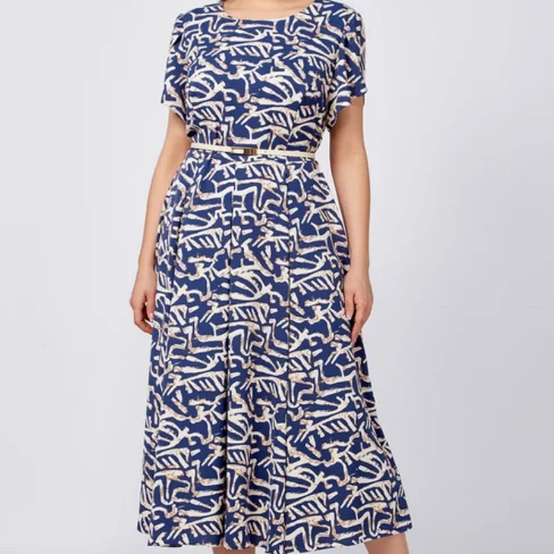 Lieferumfang: 1 x Damen-Kleid mit trendigem, blauem Aufdruck, kurzen Ärmeln und Gürtel.
