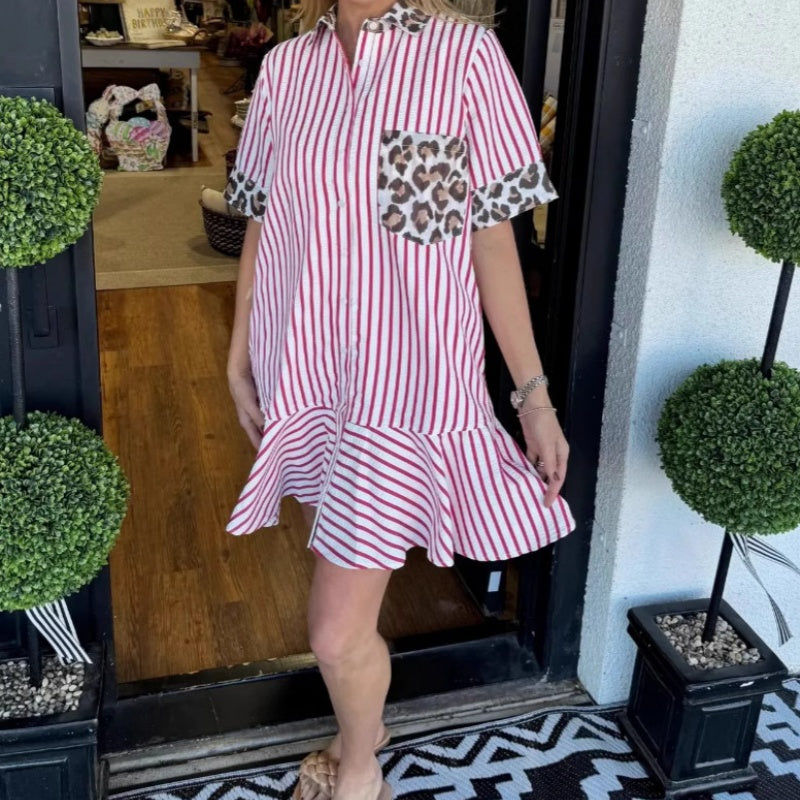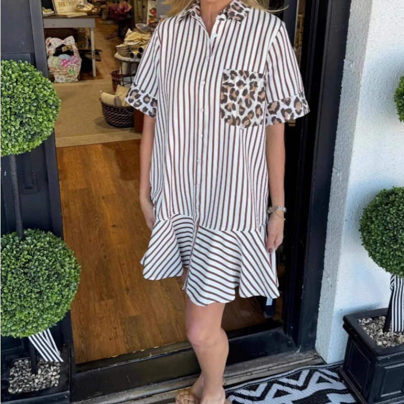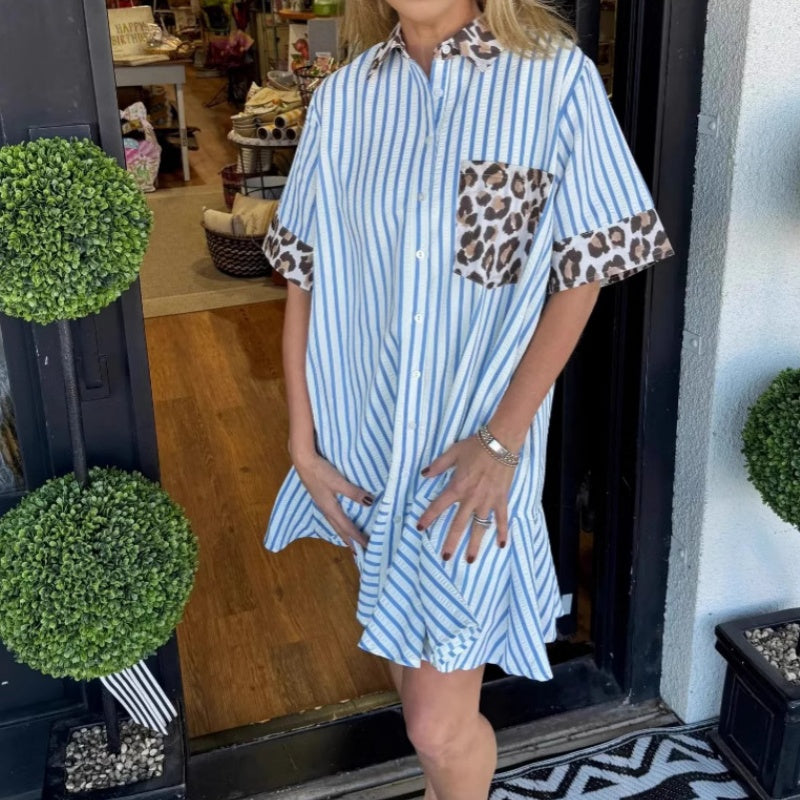 1 × Damenmode gestreiftes Patchwork-Hemdkleid mit Leopardenmuster